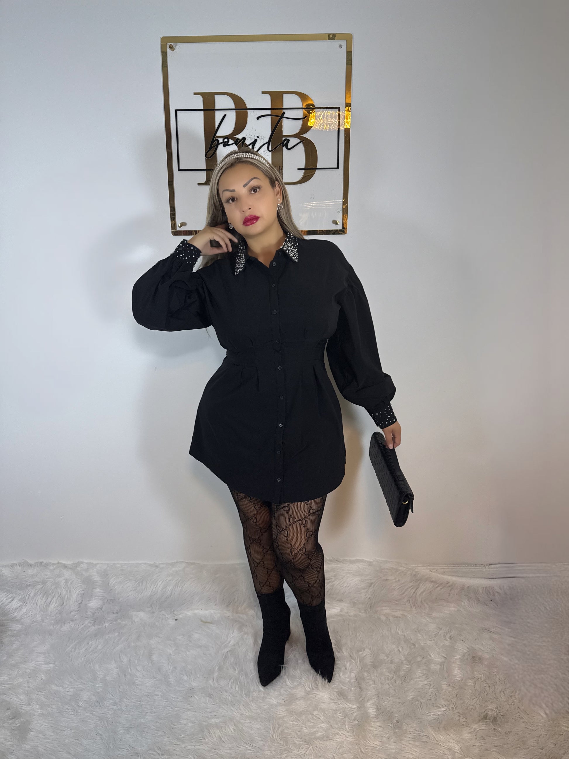 Turn heads in our Bonita Button Up β a chic black shirt dress that blends sophistication with a touch of edge. Featuring dramatic puff sleeves, a structured waistline that flatters your silhouette, and crystal-studded details on the collar and cuffs, this dress is made for the modern it-girl. Perfect for brunch, date night, or a city stroll β style it with heels or ankle boots for a polished, confident look.