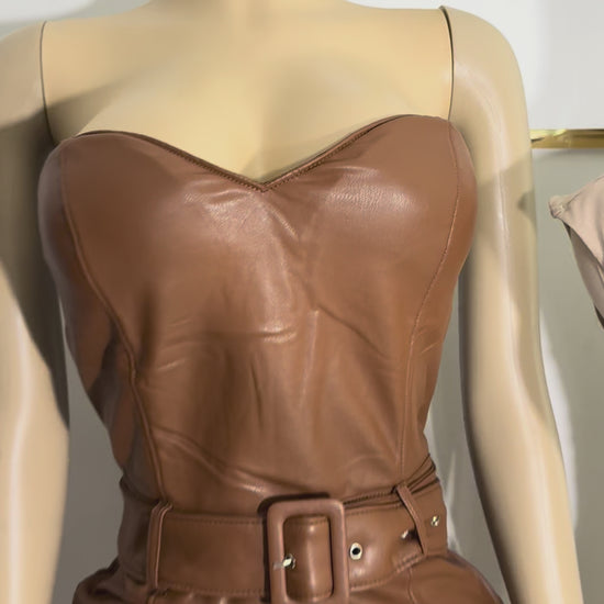 Turn heads in our Café Luxe Leather Jumpsuit, a statement piece that radiates confidence and sophistication. This sleek strapless jumpsuit features a flattering sweetheart neckline, a fitted silhouette that hugs your curves in all the right places, and a matching belt to cinch the waist for that hourglass finish. Crafted from soft faux leather in a rich caramel tone, it’s the perfect blend of bold and chic.