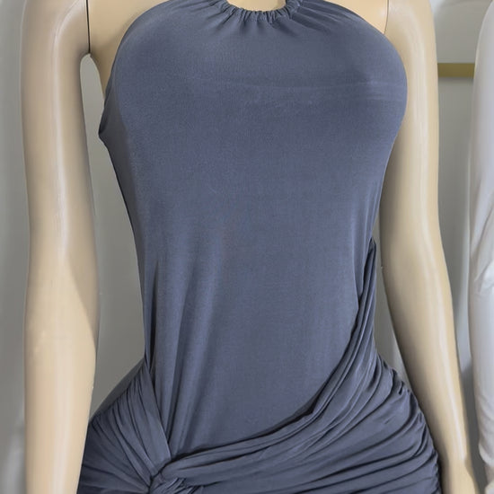 Turn heads in our Charcoal Dreams Halter Dress, a sleek and flirty piece perfect for a night out. This mini dress features a halter neckline with a gold ring detail, a flattering ruched side design, and a stylish draped tie accent that adds a touch of sophistication. The soft, stretchy fabric hugs your curves while keeping you comfortable all night long.