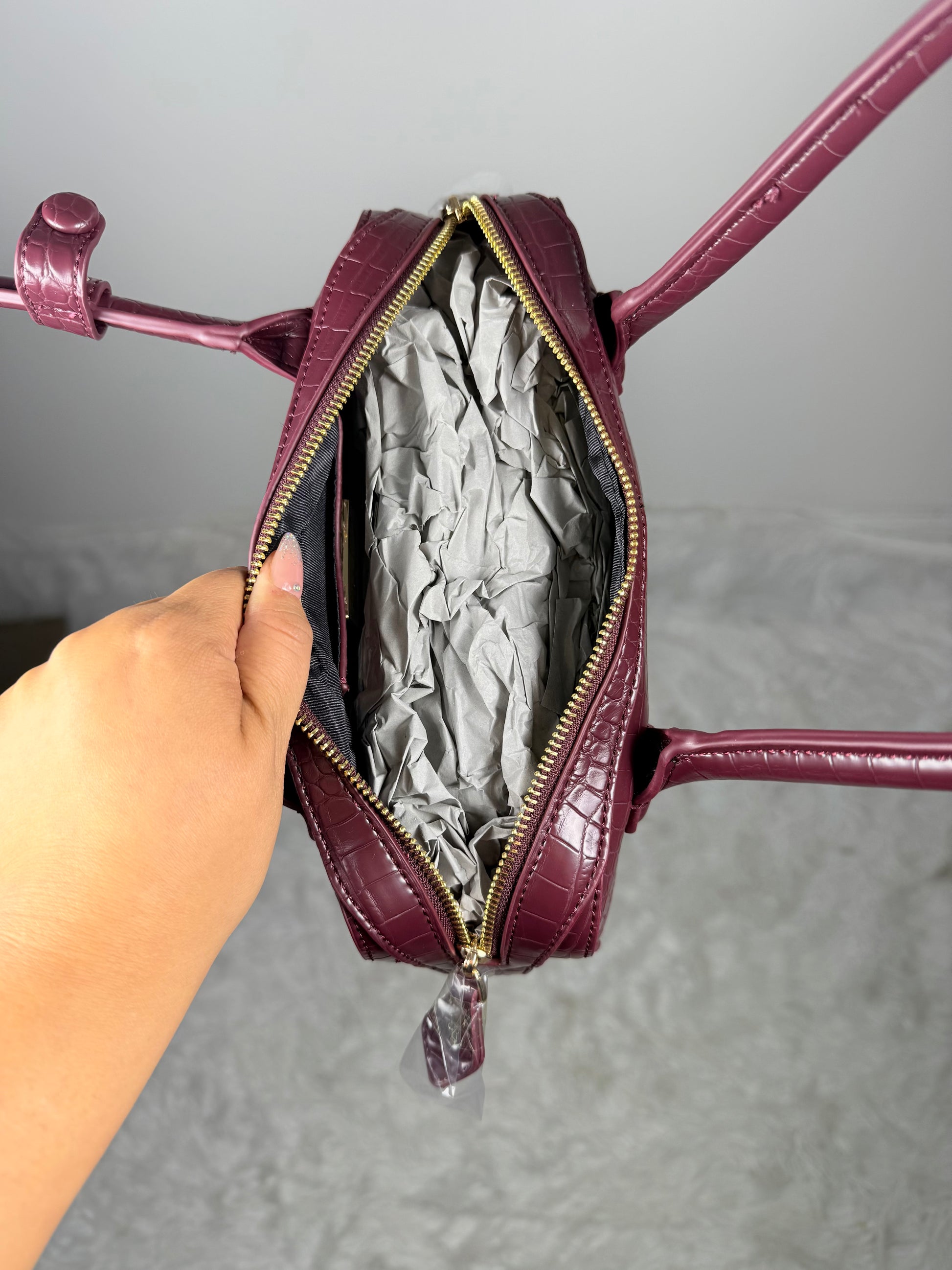 Make a statement with our Croc Shoulder Bag in a deep wine hue — the perfect mix of elegance and edge. Crafted with a glossy crocodile-embossed finish and gold-tone hardware, this structured piece adds instant sophistication to any outfit. Designed with dual top handles and a secure double zipper closure, it’s ideal for your day-to-night essentials.