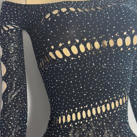 Turn heads in this stunning off-the-shoulder jumpsuit, designed for the woman who loves to sparkle. Crafted in a black tone and fully embellished with shimmering rhinestones, this curve-hugging piece features elegant cutout details along the neckline and waist, adding a sultry touch. The sheer embroidered legs create a sophisticated yet bold vibe, while the sleek silhouette elongates your figure. Perfect for special occasions, parties, or a night out where you want all eyes on you.