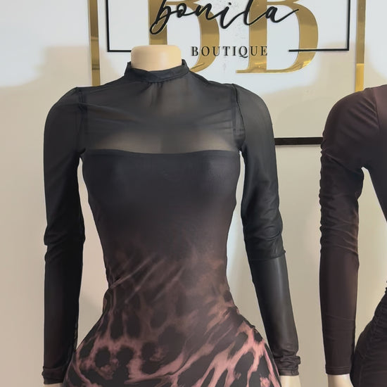 Turn heads in our Wild Desire Midi Dress! This curve-hugging bodycon features a bold ombré leopard print that fades beautifully from deep black to warm chocolate tones. Designed with sheer long sleeves and a high neckline for that perfect mix of fierce and classy 2 piece, Stretchy fit that moves with your body — made to make you feel confident and unstoppable.